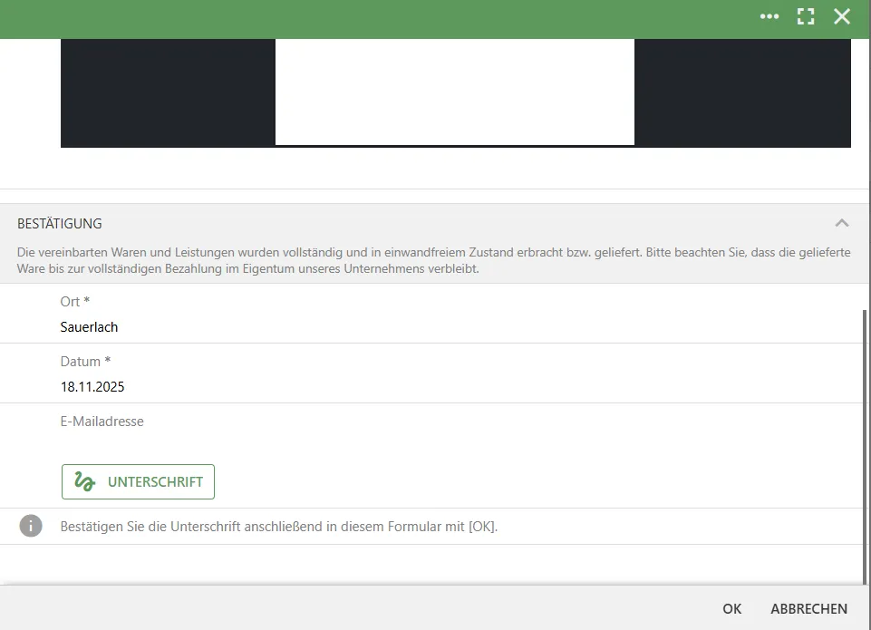 Der Kunde kann hier die gelieferten Waren und Leistungen im angezeigten Lieferschein überprüfen. Optional können Ort, Datum und E-Mail-Adresse geändert oder ergänzt werden.