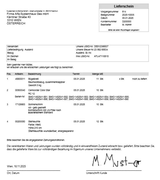 Der Lieferschein wird in einer Belegdruckvorschau angezeigt.