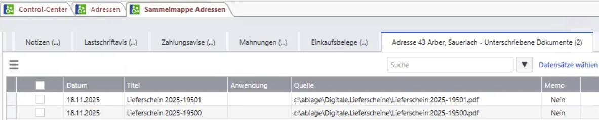 Als Nachweis werden die unterschriebenen Lieferscheine automatisch in der Sammelmappe der Kundenadresse abgelegt. Bei Bedarf können die Lieferscheine auch manuell an den Kunden versendet werden.