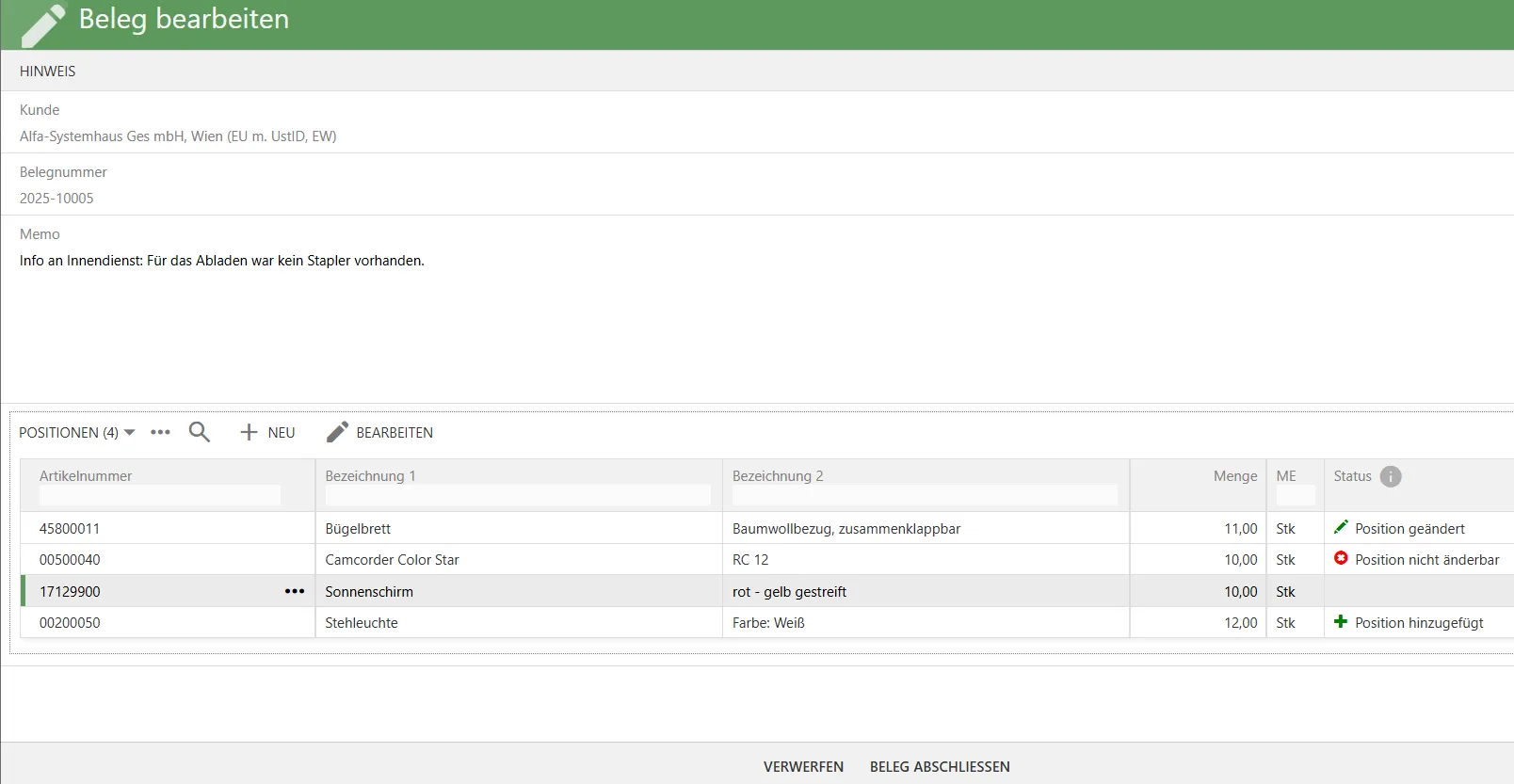 - Position nicht änderbar: Die Position kann nicht bearbeitet werden, da sie seriennummern- bzw. chargenpflichtig ist oder die Menge auf mehrere Lagerplätze verteilt ist.